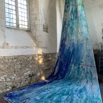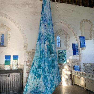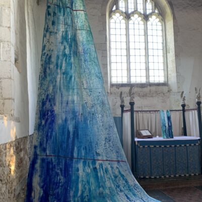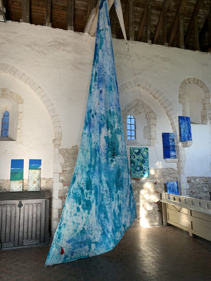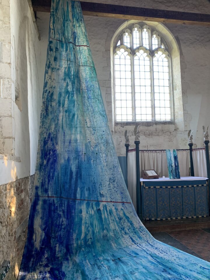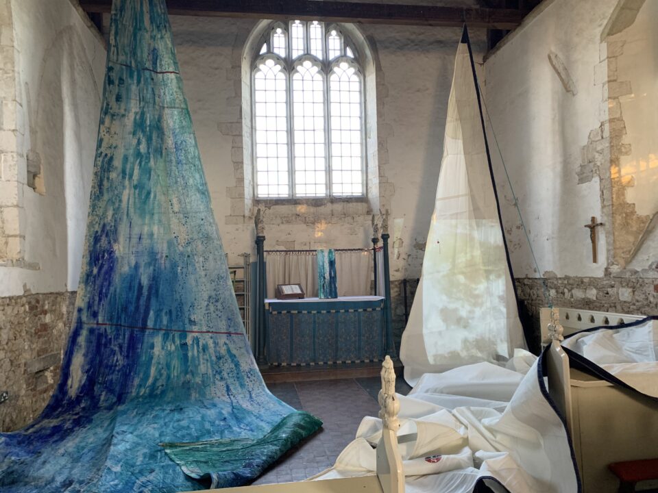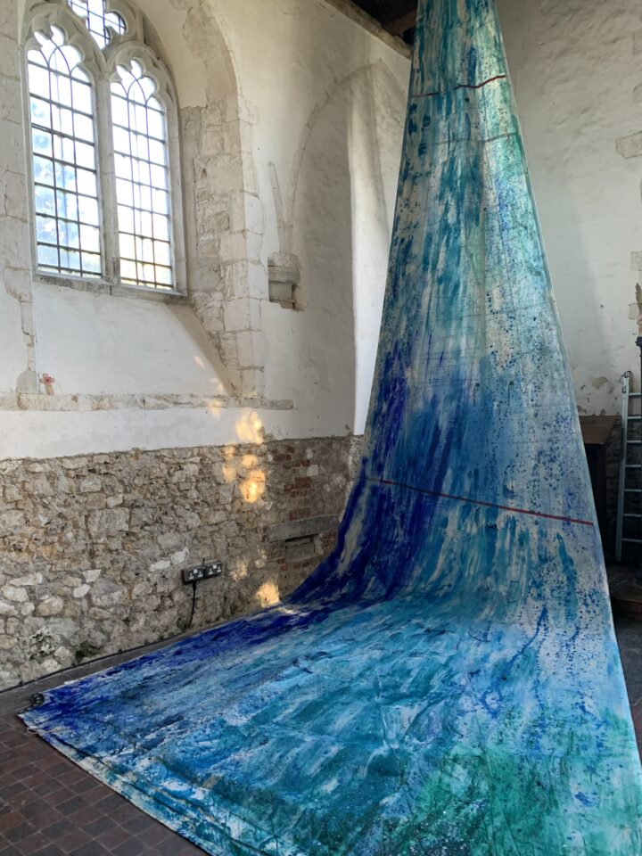Clean Clear Water was a site specific installation in St Marys Church, Burham on the banks of the River Medway. It consisted of painted sails and projected images exploring the power of nature and concepts within the symbolism of clean, clear water and the wind. The images were filmed whilst sailing in Krka National Park, Croatia.