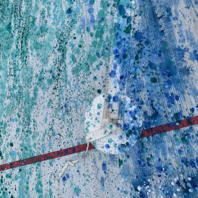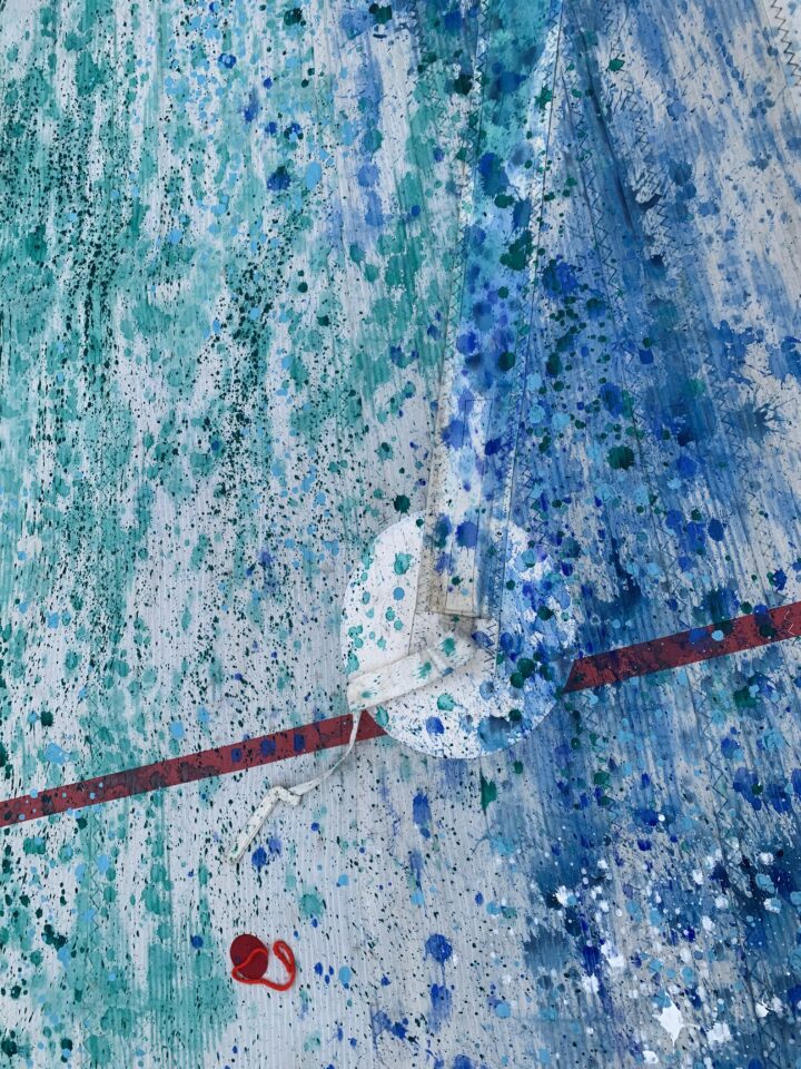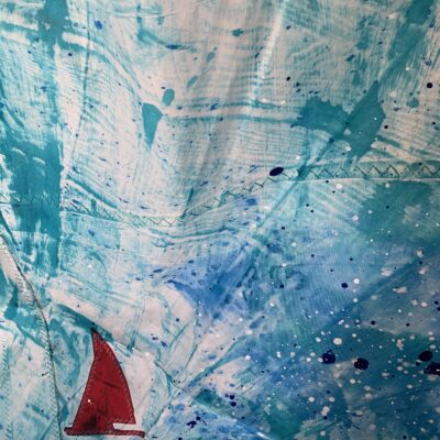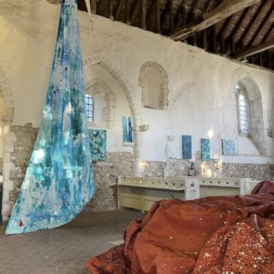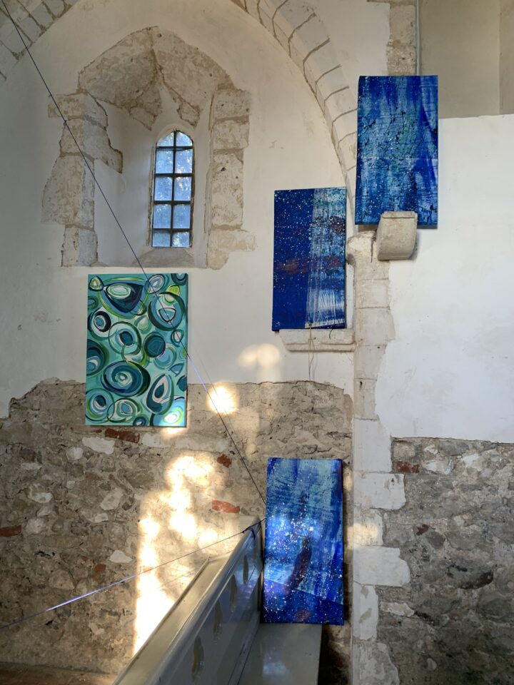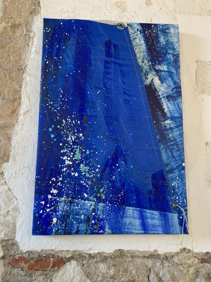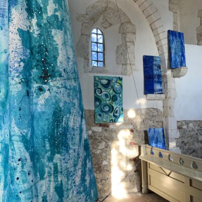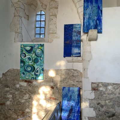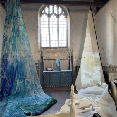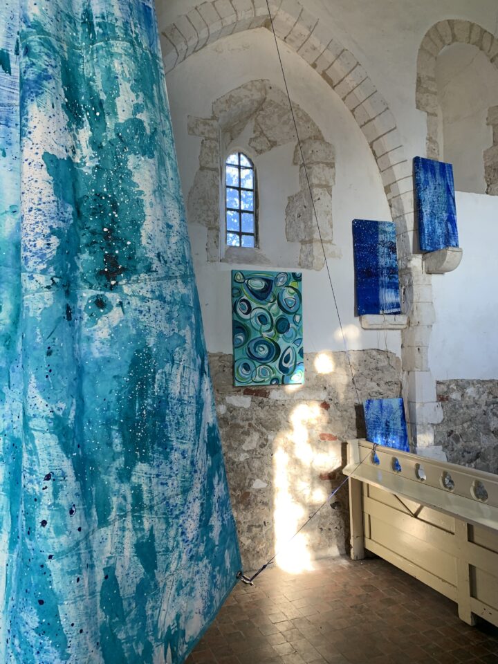 Clean Clear Water was a site specific installation in St Marys Church, Burham on the banks of the River Medway. It consisted of painted sails and projected images exploring the power of nature and concepts within the symbolism of clean, clear water and the wind. The images were filmed whilst sailing in Krka National Park, Croatia.