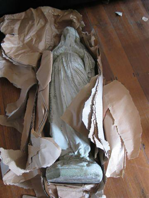 The Virgin Archive exhibition at the Horsebridge Arts & Community Centre in Whitstable, Kent includes all of the images of the purchased Virgins that Shaw was sent. Showing the archive in its entirety is part of this element of democratisation. However, Virgin Archive is still Shaw’s project. She is the curator and the keeper of the work, storing it for future use. The archive maps the geographical locations of the purchased Virgin’s – Australia, Western Samoa, Essex, Whitstable, Brighton, Canterbury, the New Forest and Lincolnshire, and also documents and records the exact physical locations of them – orchard, sitting room, loo, forest, garden. What Virgin Archive also does is document the Virgin as art object. Firstly as Shaw’s original vision of her as part of the Lourdes installations and secondly as her owners vision of her – be it as a kitsch icon bedecked in fairy lights in the corner of the sitting room or as a statue to meditate and pray with, placed in a secluded part of the garden surrounded by flowers and trees.
